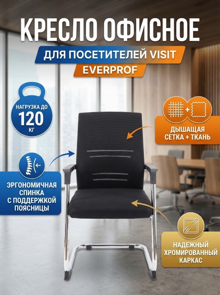 Кресло для посетителей Everprof Visit с комфорным мягким сиденьем и спинкой из сетчатой "дышащей" ткани. Подлокотники металлические с накладками, полозья металлические хромированные.